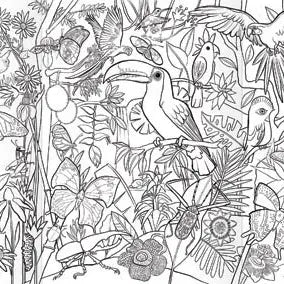8 high Quality, double-sided colored pencils offering 16 vivid colors bundled with an intricate fold-out coloring mural teeming with birds and butterflies and details by illustrator Linda Bleck