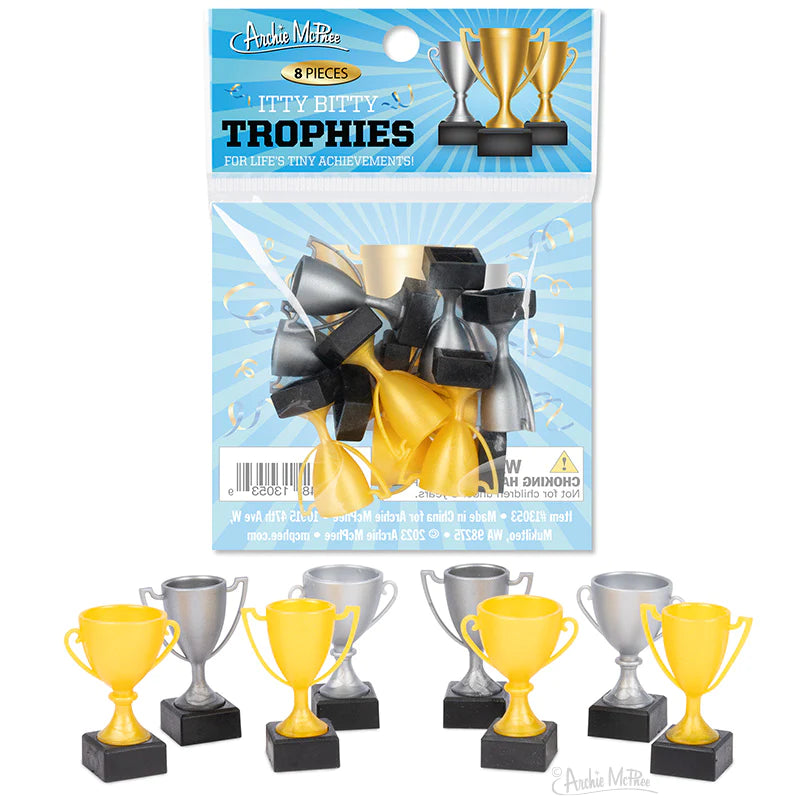 Itty Bitty Trophies are for winners of all sizes and abilities. While we appreciate the things other people do for us, not everything is worthy of a full-size trophy. These eight Itty Bitty Trophies are for those moments when you want to award someone for something small, like picking up your laundry at the dry cleaner or just being there for you on a bad day. These 1-1/4" tall, soft vinyl trophies come in two different colors (gold and silver). Can be used in a sarcastic or heartfelt way, depending on your mood.