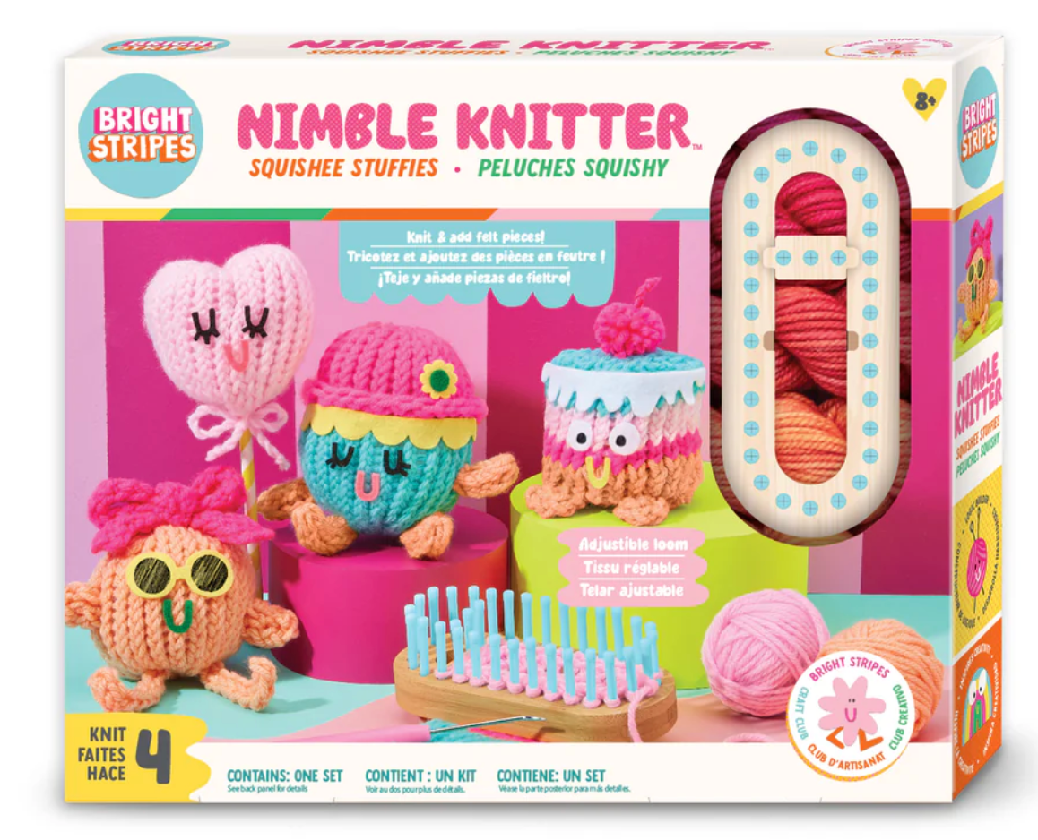 Knit adorable characters using the Nimble Knitter adjustable loom! With 4 colors of yarn, tons of face stickers, pipe cleaners, stuffing and more, it's the perfect device to make fun knit pals! Make 4 little guys or one larger character. The patented loom with bamboo base has a moveable puzzle piece which lets you knit different tube widths. The loom works with #4 yarn weight, so you can keep using this heirloom-quality, handy device!