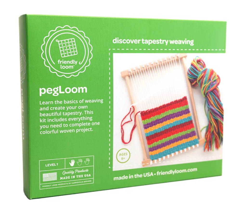 Recommended for ages 6 and older. PegLoom includes everything needed for a complete woven project up to 5 ½” x 9”!