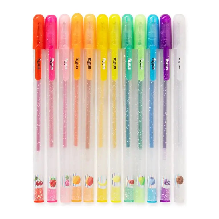 Our beautifully packaged scented + sparkle GELLIES are smooth-writing gel pens in pretty, sparkly colors. Fresh fruit scented! Set of 12 pens.