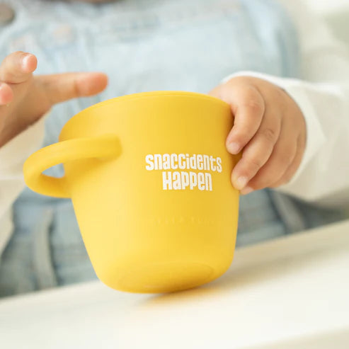 Exclusively ours, the Happy Snacker is the first two piece silicone snack cup! No more trails of crumbs to pick up thanks to our snap tight lid - go ahead and put the vacuum away. Designed with easy grip handles for little hands to independently self-feed. Hold the applause because there’s more… The horizontal handles allow the cup to securely fit in the car seat and stroller cup holders. The simple two-piece design makes pouring in snacks a breeze! The mess proof, tight lid stays in place. The soft silicone opening allows little hands to easily access food and prevents spills. Just pop the lid off when you are ready to clean it, each piece is dishwasher safe. Happy snacking! FEATURES -Snug fit and removable lid -Fits most cup holders and snack trays -Soft opening -Great for home or on-the-go