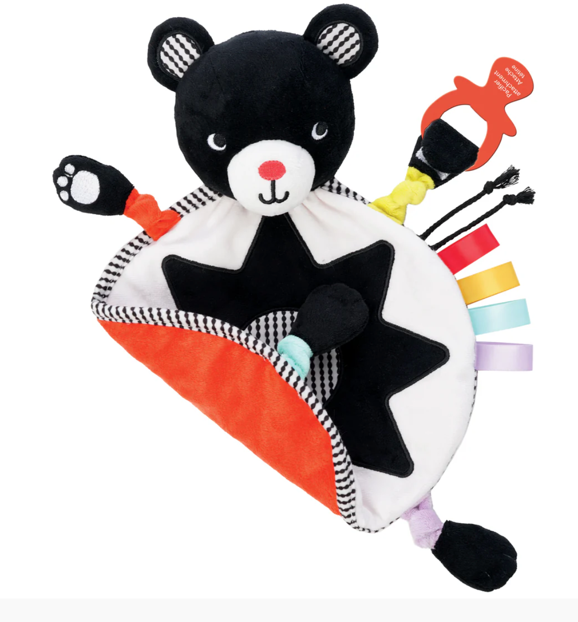 A beary-good companion for baby. This black, white, and red bear lovey has knotted paws for touching and chewing and a paci-holder!