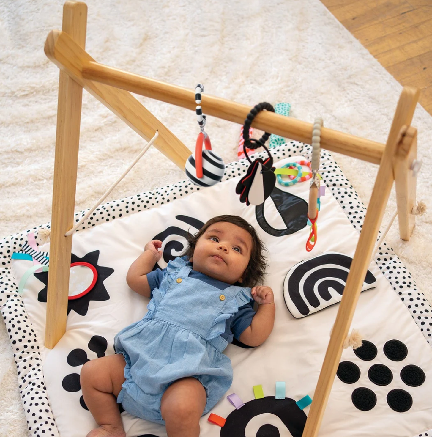 An eye-catching rattle ball activity toy for sensory play and exploration! This unique rattle ball is excellent for hanging on a play gym or rolling across the floor in front of baby’s line of site. With one slight touch or batting at the ball, it spins and offers a mesmerizing black-and-white bullseye display to captivate baby’s attention. The high-contrast design and vibrant red colored arch support baby’s natural visual progression as they learn to focus and begin to see colors. Fun fact, the first color baby’s see is red! The C-clip easily attaches to baby links, strollers, carriers, play gyms and more.