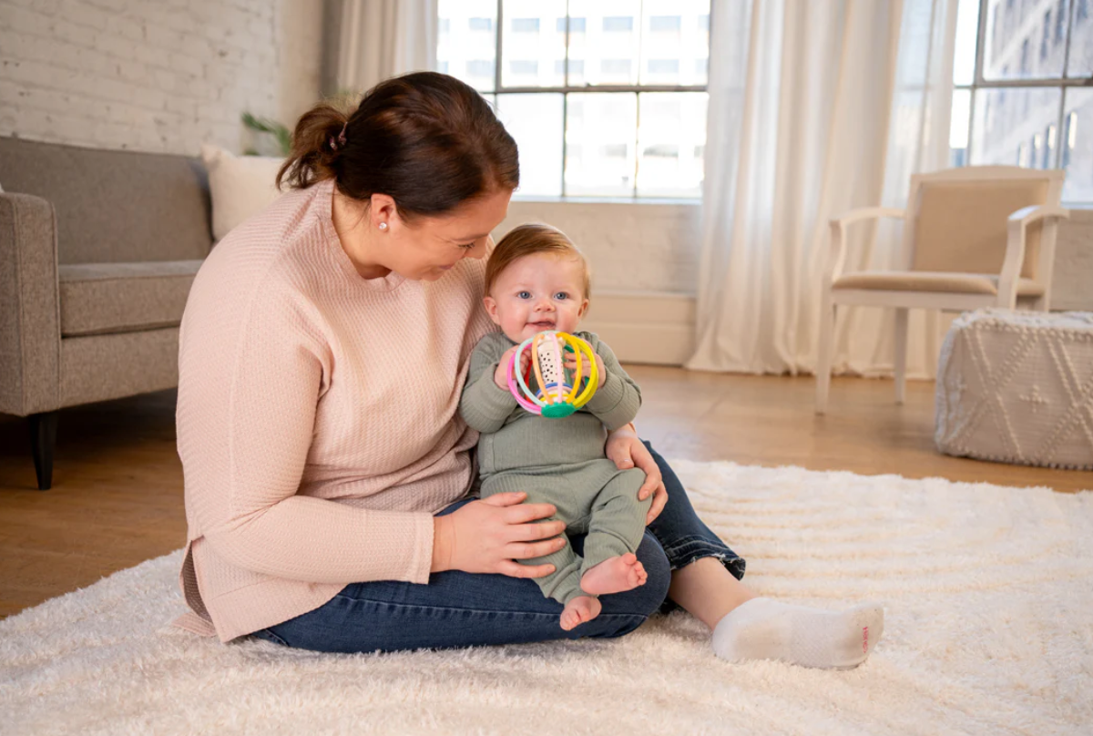 Colorful flexible plastic tubes make shaking, teething, and rolling fun. Enjoy soft whistling sounds and clacking rings with every shake.