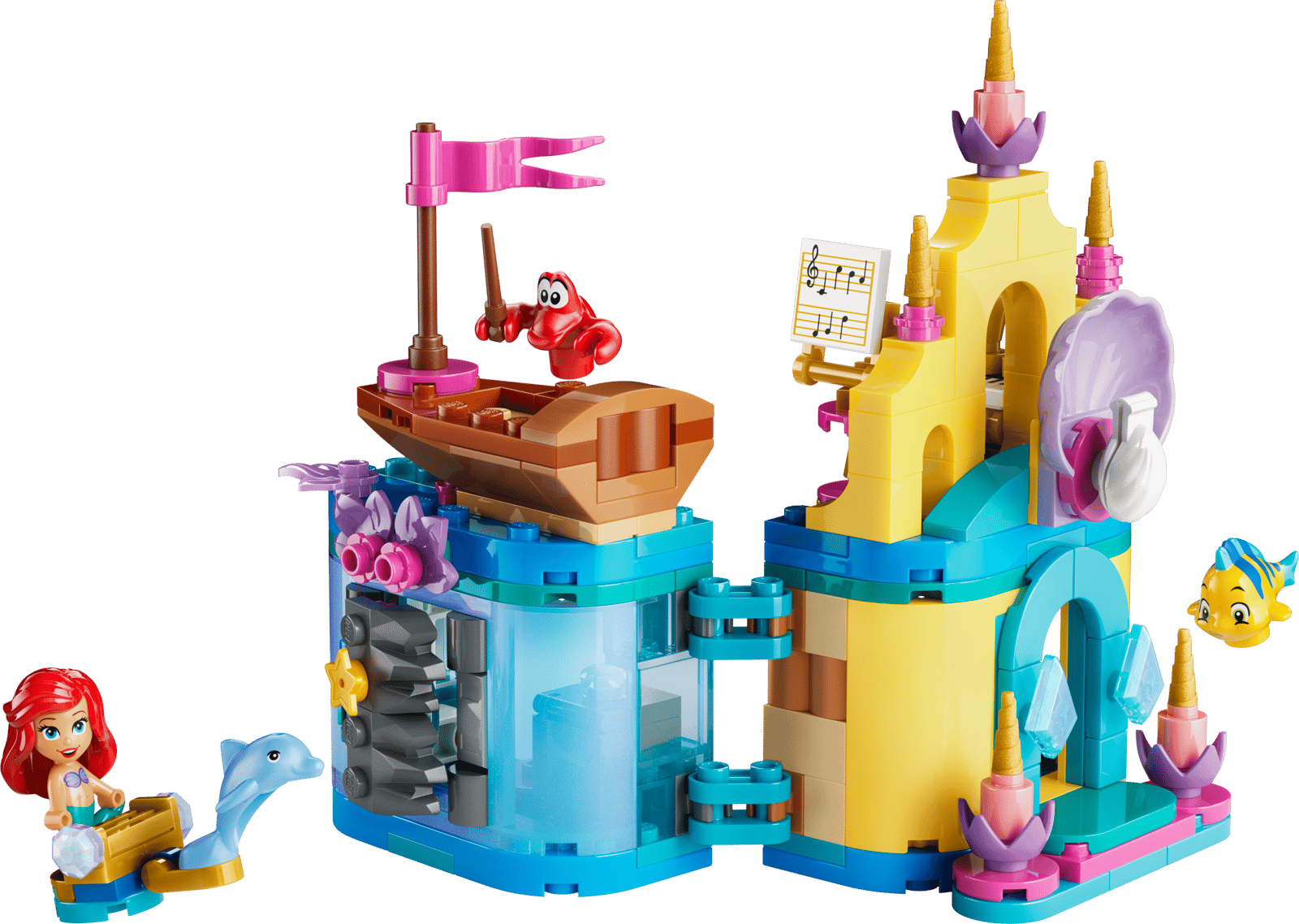 - DISNEY’S THE LITTLE MERMAID TOY BUILDING SET – Ariel’s Magical Mini Palace (43285) features Ariel, Flounder and Sebastian LEGO® ǀ Disney characters, a small boat and a lockable mini-palace and grotto