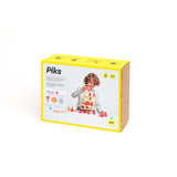 The Piks Medium Kit includes 44 pieces: - 33 silicone cones (non-toxic) - 11 beech planks (solid wood) - 1 instruction booklet (includes examples of Creative Maps) - An OPPI® natural cotton bag” Detailed description: Piks is a building game designed to develop concentration and creativity in children. The principle is simple: create the most original and impressive structures without dropping any parts! Its silicone cones of different sizes and colors adhere to wooden boards: an innovation that defies the laws of gravity and balance and instills a whole new dynamic of play. Packaging dimensions (cm): 26x20x10.5 Materials: Solid wood (beech) from eco-responsible forests (FSC) /Silicone (non-toxic) Recommended age: from 3 years old Number of pieces: 44pcs
