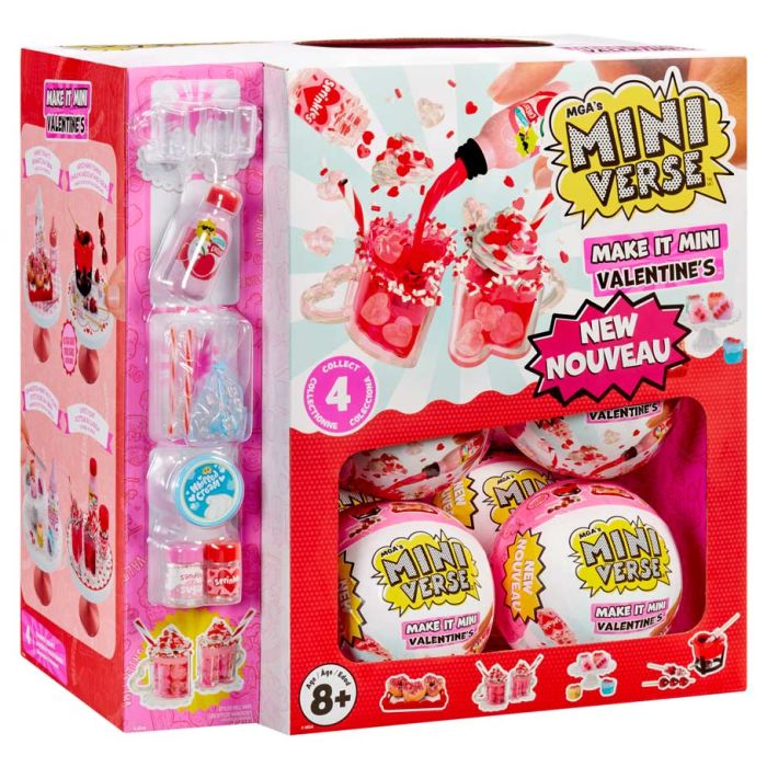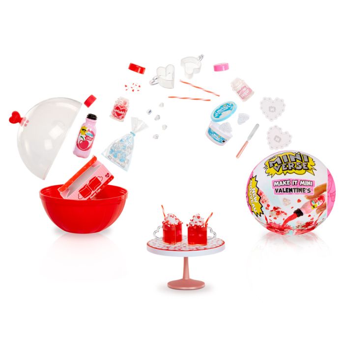Each surprise ball is filled with realistic Valentine's-themed "ingredients" and accessories to make mini replicas of favorite snacks! Whether it’s Heart Donuts or Cupid's Floats, the fun is in the mystery - unbox to see which mini delight you got! Check the collector's guide to discover which Valentine treat you’ve unwrapped. Then, follow the "recipe" card to create your mini collectible or mix it up with a #MiniverseRemix for extra fun!