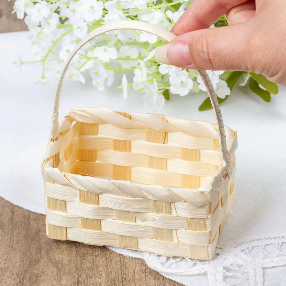 This Mini Rectangle Bamboo Basket with Handle is a charming addition to any celebration or decor. Made from woven rattan, it brings a natural touch to Easter, weddings, and baby showers. Basket: 3-3/4" x 2-1/2" x 2" H Height w/Handle: 5"