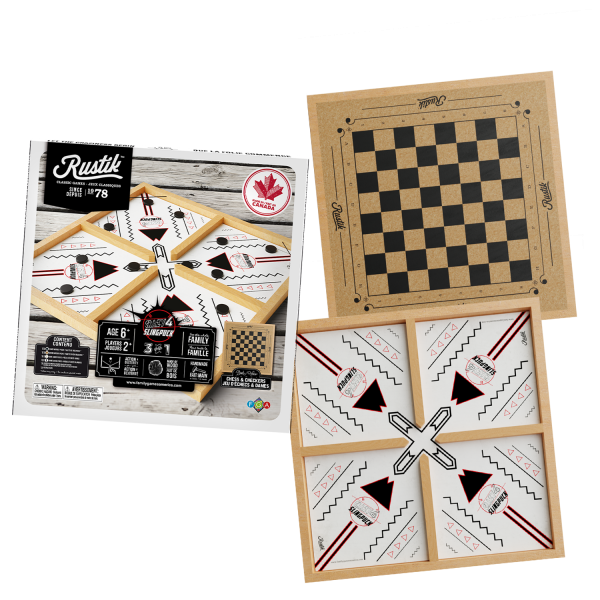Classic Chess/Checkers is played on one side, then the board flips over for a crazy game of 4-player Sling puck that has participants using the elastic bands to propel their chip through the small channels in the middles into the opposite side. CRAZY!