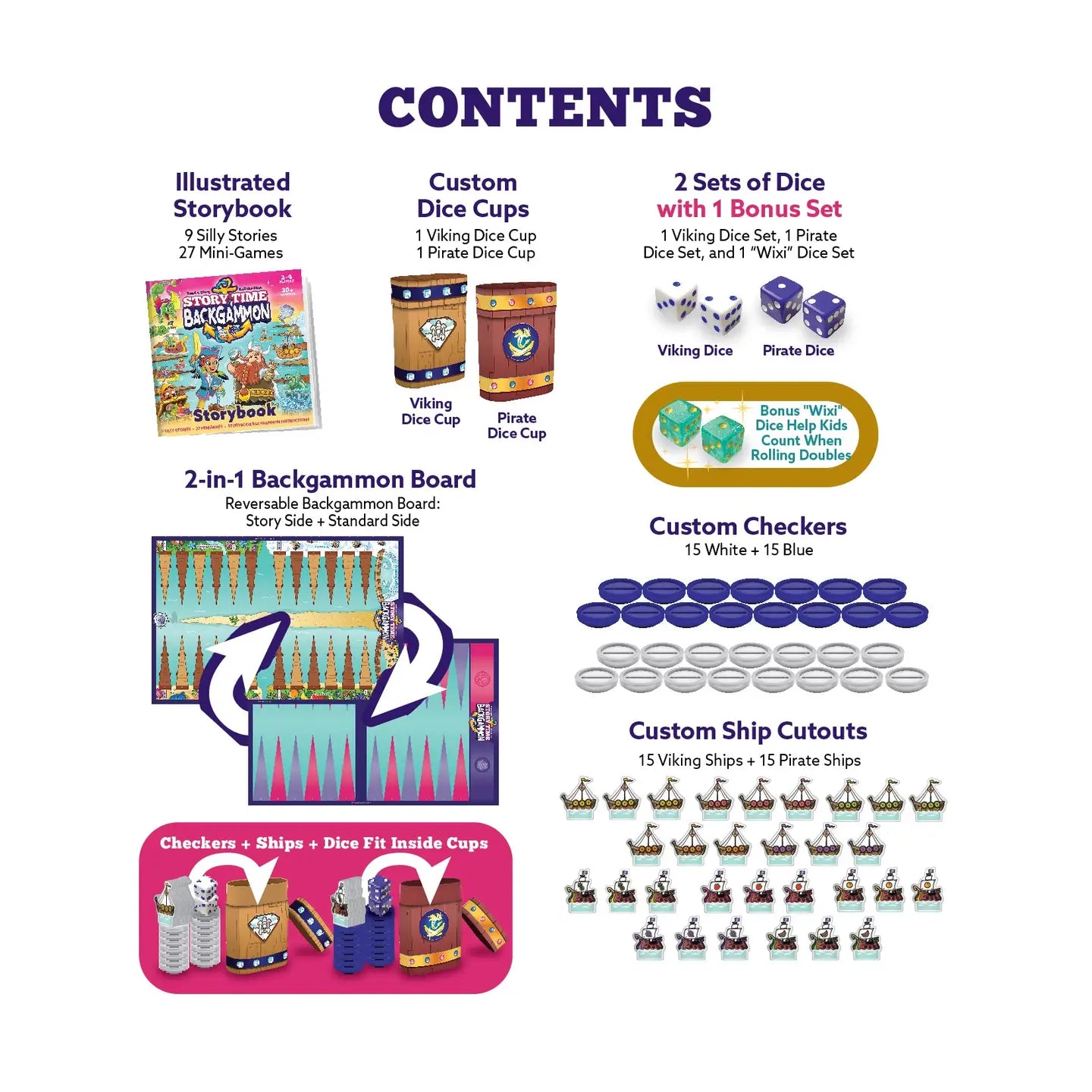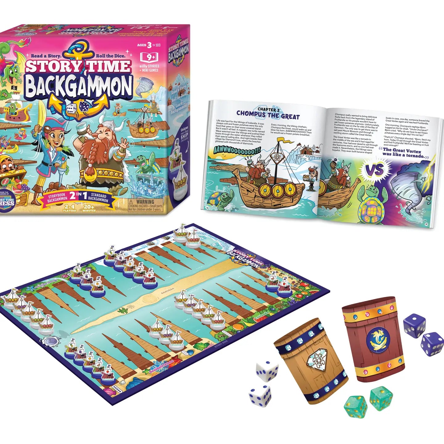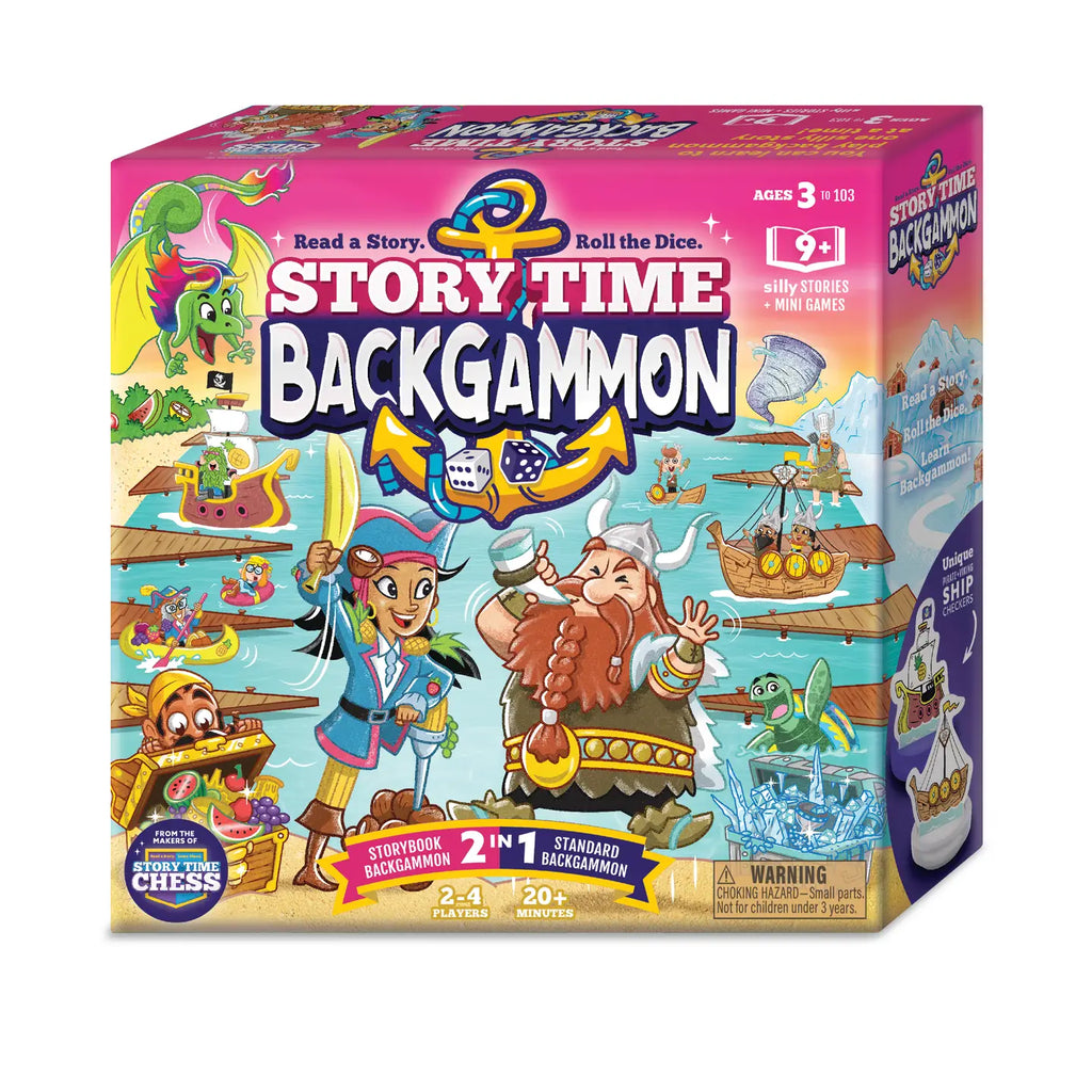 Story Time Backgammon is a high seas adventure that teaches kids as young as three how to play one of the world’s most popular games. This game tells the tale of a Viking chieftain, Chompus the Great, and a swashbuckling pirate, Peglegra the Bold. Aided by magical dice and their animal companions, Wind and Wave, Chompus and Peglegra race their ships from dock to dock in search of treasure and glory! Story Time Backgammon’s hilarious stories, unique mini-games, illustrated board, and custom pieces enable anyone to teach their youngsters the game—no backgammon experience necessary! As kids have a blast discovering the rules alongside the characters, they’ll also develop critical skills including arithmetic, sequencing, strategic thinking, problem-solving, and more.