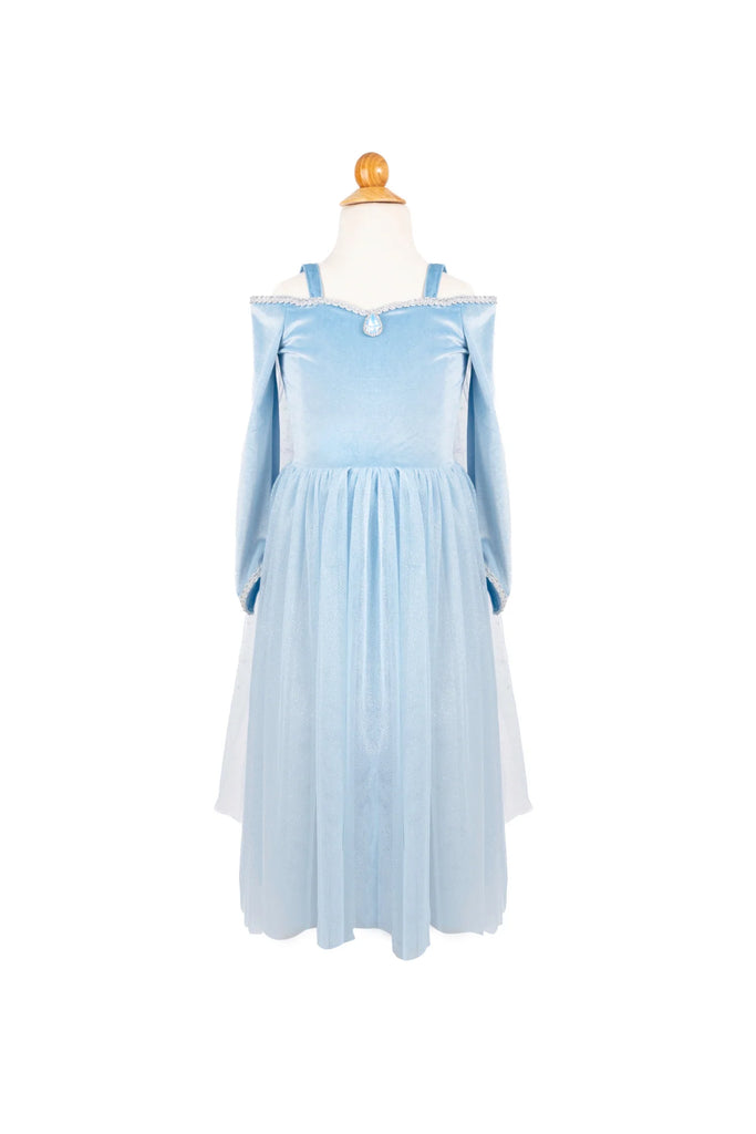 Step into a world of enchantment with the Velvety Soft Sisters Forever Princess Dress, a magical creation inspired by the bond of sisterhood. The light blue velvet top offers a soft, luxurious feel, while the spaghetti straps and off-the-shoulder long sleeves add a touch of elegance. The top is beautifully trimmed with silver accents and features a sparkling blue gem in the center of the chest, adding a royal flair.
