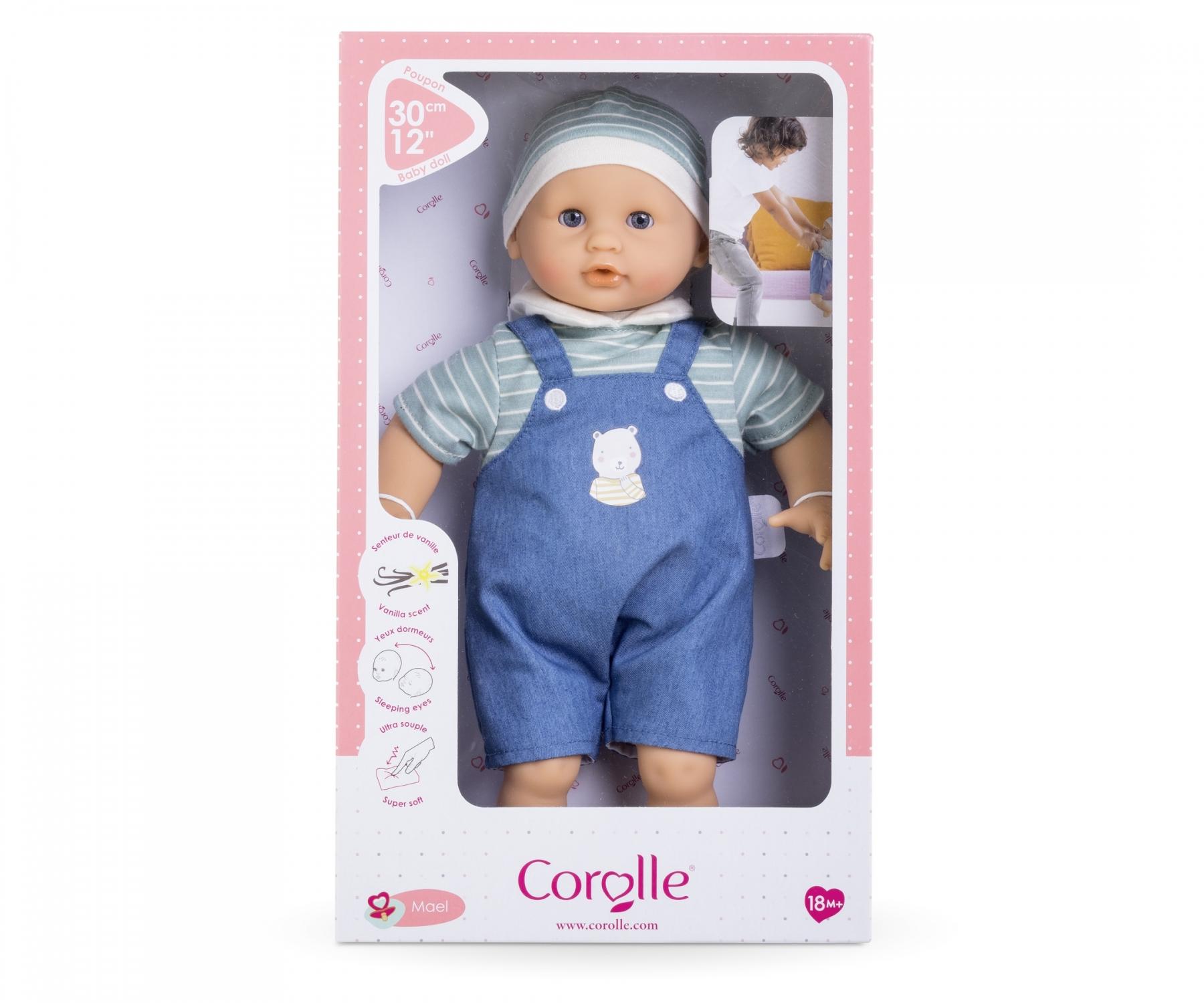 Bébé Calin Mael is a 12-inch baby doll that is perfectly sized to be cradled in a young child's arms and is ideal for hugging and cuddling. The doll's soft body is posable like a real baby, it can even suck its thumb, also like a real baby. Mael's head, arms and legs are made of touchably soft vinyl that is delicately scented with vanilla -- a Corolle signature -- so that the hugs children give their doll are as sweet and memorable as the hugs their parents give them. Bébé Calin Mael has blue sleepy eyes that close when it's put down for a nap or at bedtime. Dressed in blue overalls, a striped T-shirt with a matching cap, Bébé Calin Mael is part of the mon premier poupon Corolle collection of dolls, clothing and accessories for beginning doll play. Ages 18 months and up.