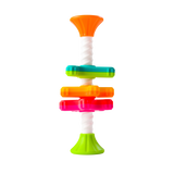 Go-anywhere sensory toy with propellers that spin down a corkscrew pole