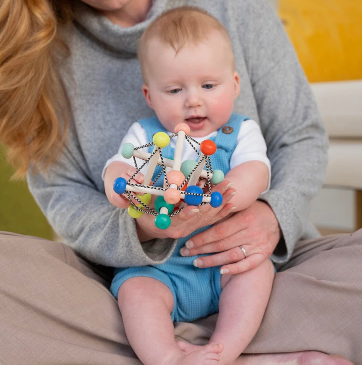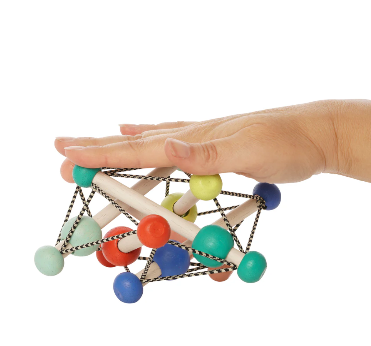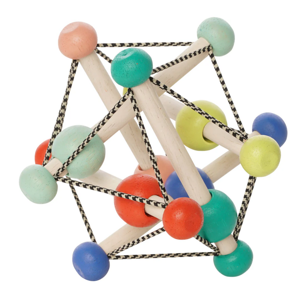 Enjoy, this one-of-a-kind squishable wooden rattle and teether toy that is made from renewable rubberwood and strung together with durable elastic cords!