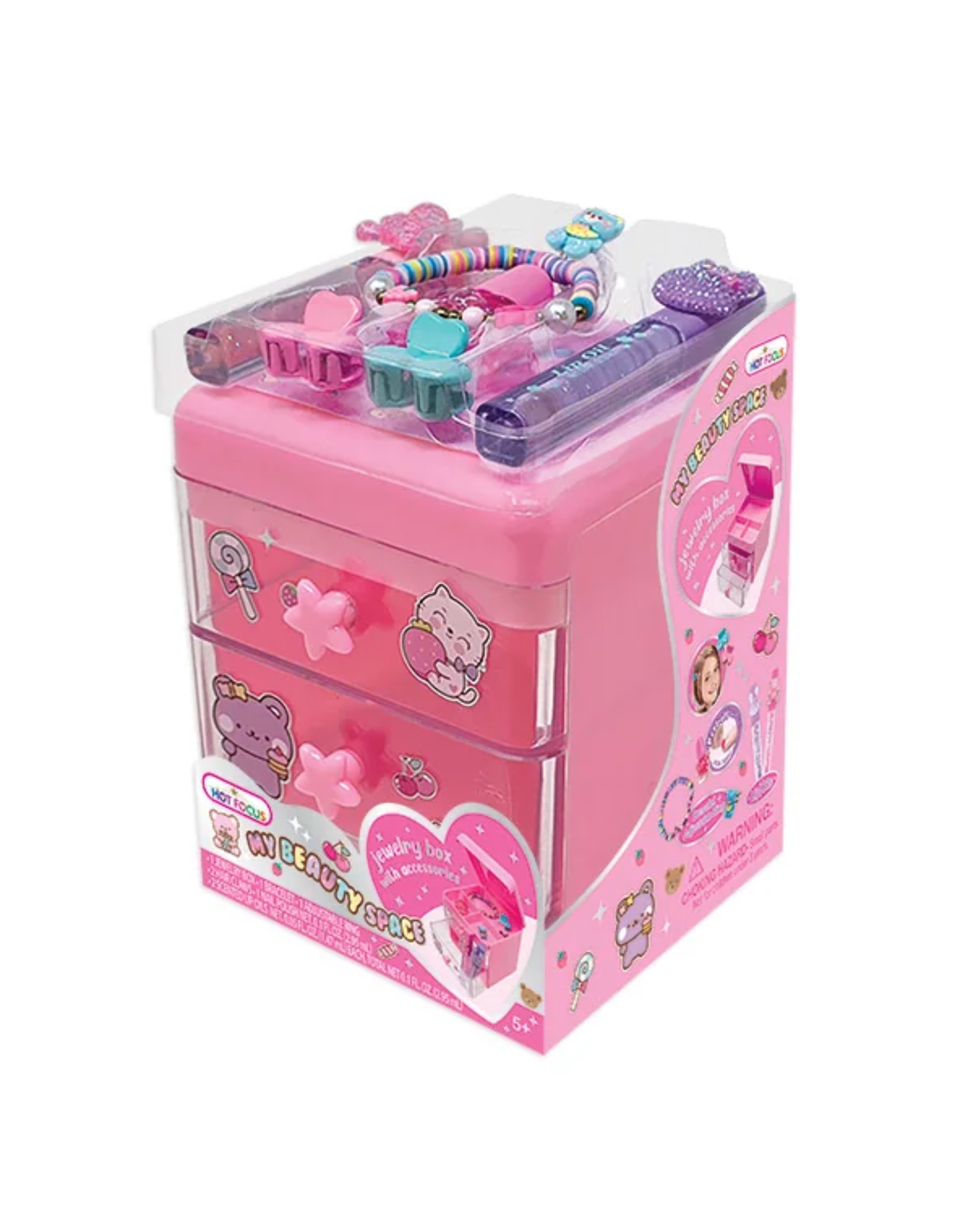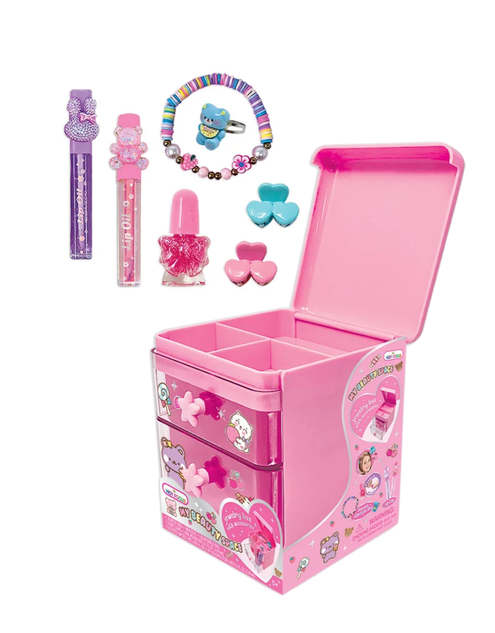 Transform your daily beauty routine with our Critters Jewelry Box! Featuring two drawers and a top lid, in addition to 1 bracelet, 1 adjustable ring, 2 hair claws, 1 nail polish bottle, and two scented lip oils. Say goodbye to clutter and hello to cute and organized (and scented!) beauty must-haves.