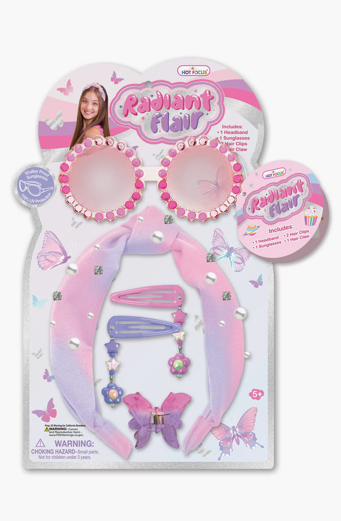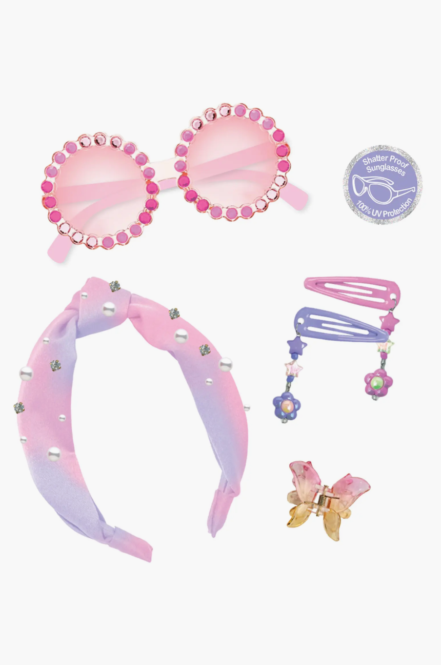 Your little ones will feel their best with this fashion set that includes hair accessories and sunglasses.
