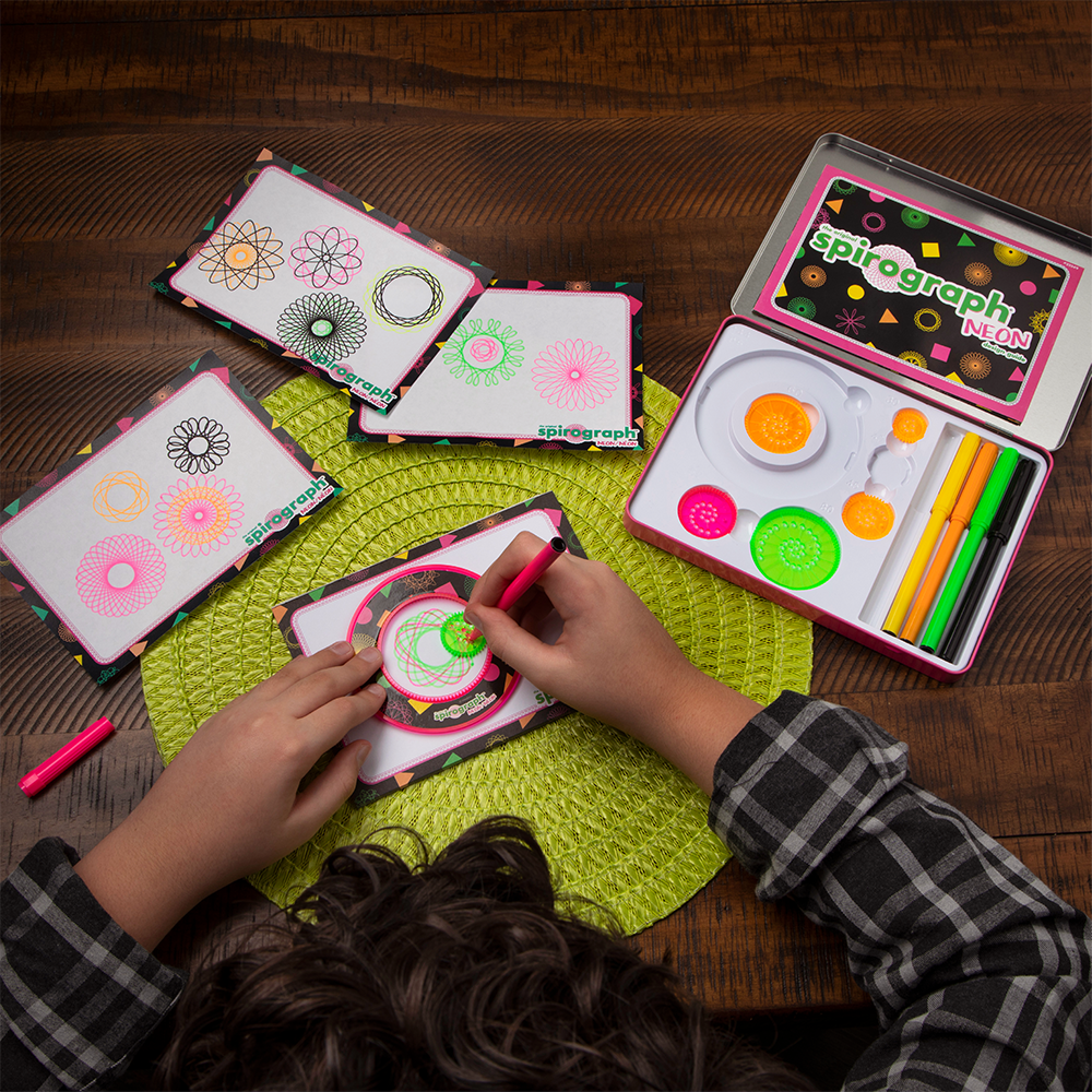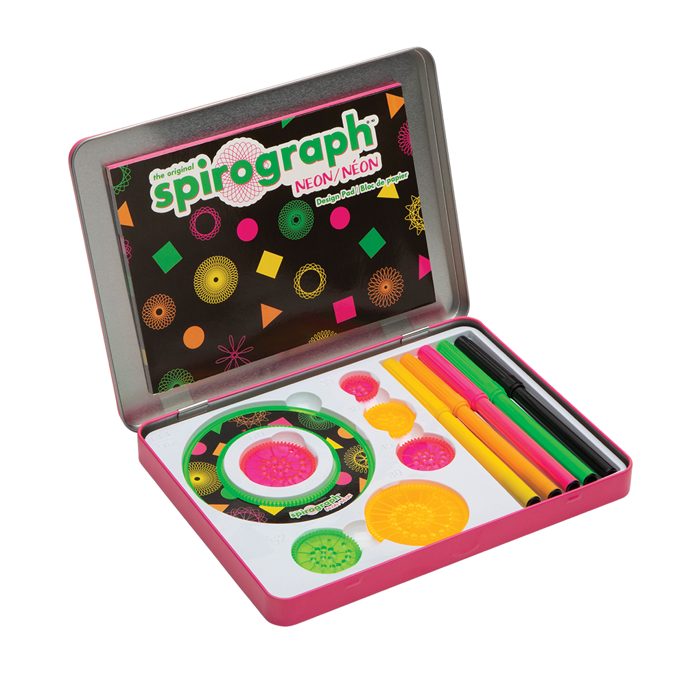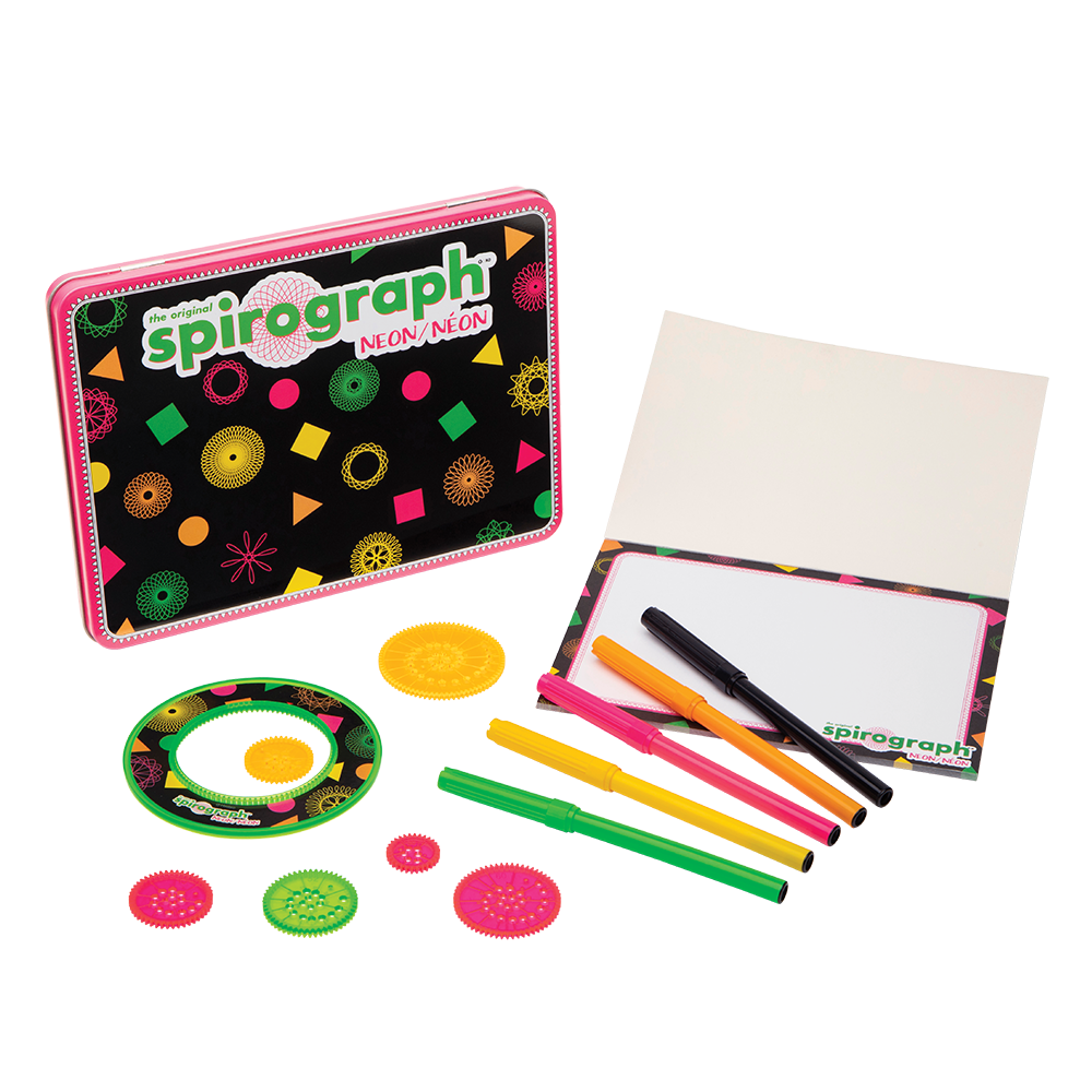 The classic way for aspiring artists to create millions of amazing designs now in NEON! Draw bold Spirograph designs in bright neon colors with vibrant wheels to match! Use on it’s own or mix and match with other Spirograph design pieces for even more design possibilities. The precision engineered Spirograph gears work with the three design pens included in the set as well as with most standard pens, markers, and pencils. Plus, the durable metal tin makes it easy to store everything when finished or take with you for fun on the go!