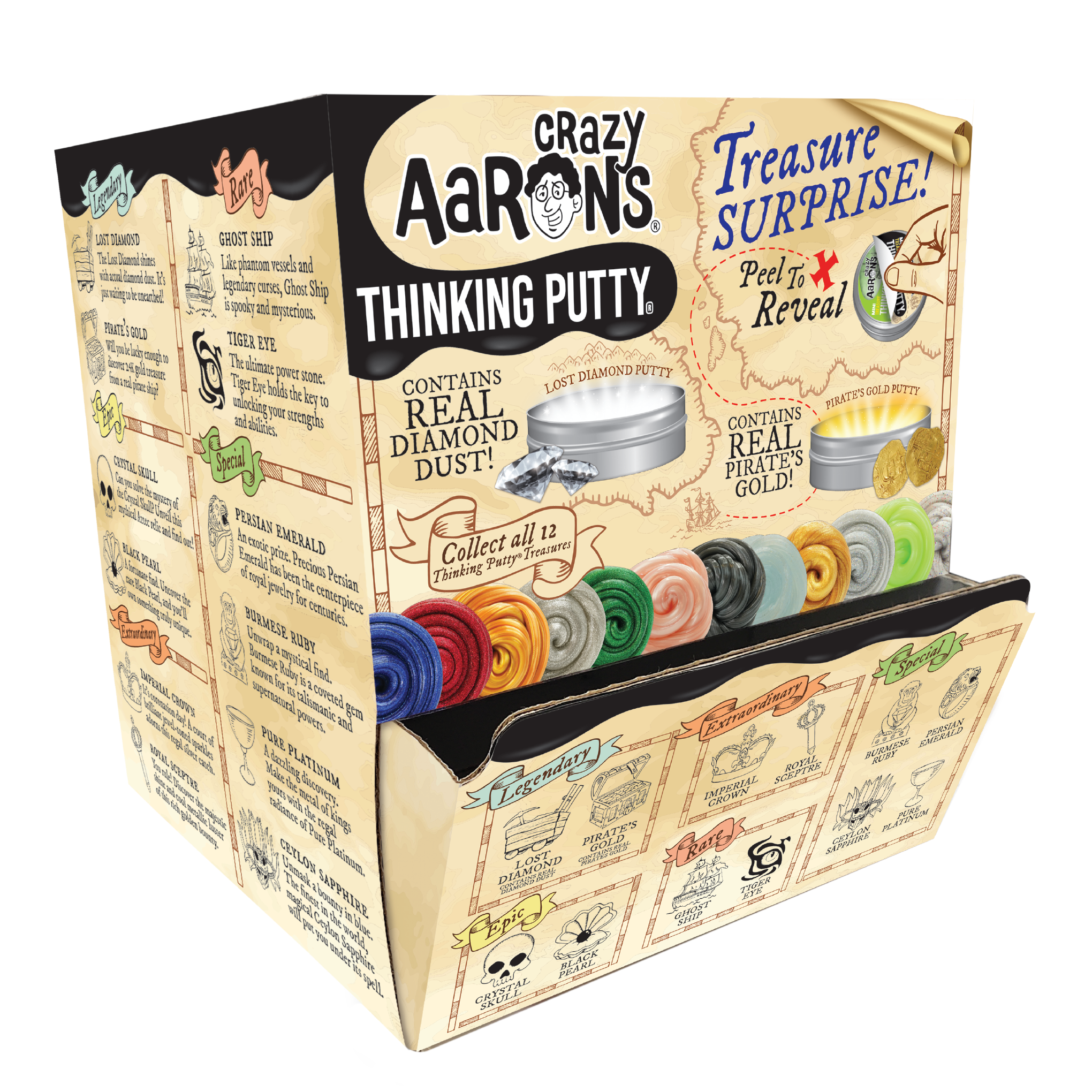 Uncover the Mystery! Peel to reveal your treasure. Collect all 12 Thinking Putty Treasures.
