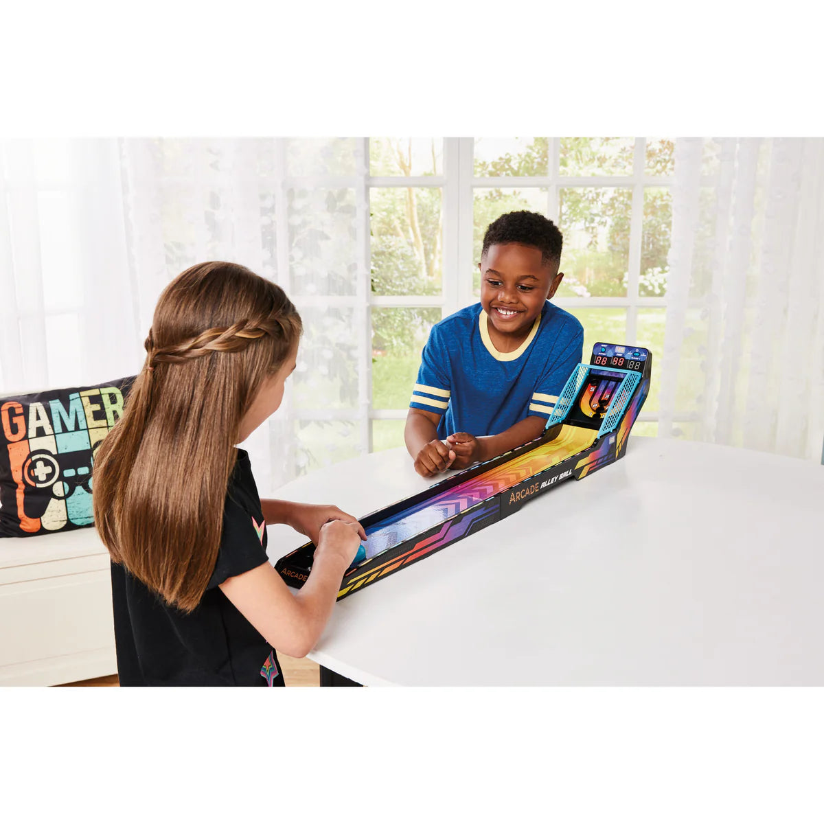 Bring the thrills & excitement of the classic arcade Alley Roller home with the Electronic Arcade Alley Ball game! Just like the arcade version you need to roll the balls down the alley, up the ramp, and into one of the target holes to score points. Each target hole has a different value, so take careful aim and send the ball flying down giant 3-foot (95cm) long track to build up your score. Includes 2 playing options β classic arcade style, in which you aim and roll the ball down the track by hand β or switch over and use the spring-powered ball launcher! Also features single player and 2 player modes β challenge a friend to score as many points as possible in 60 seconds. Features a large LED scoreboard with countdown timer and arcade sound effects. For 1-2 players. Requires 3 x 1.5V AAA batteries (not included). Recommended for ages 6 and over.