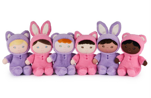 • 100% RECYCLED PLUSH BABY DOLLS: These adorable 7` plush dolls are crafted from recycled materials, including the stuffing in their playfully plump-yet-floppy bodies. All styles have a friendly smiling face and a super-soft pink or purple onesie with bear,