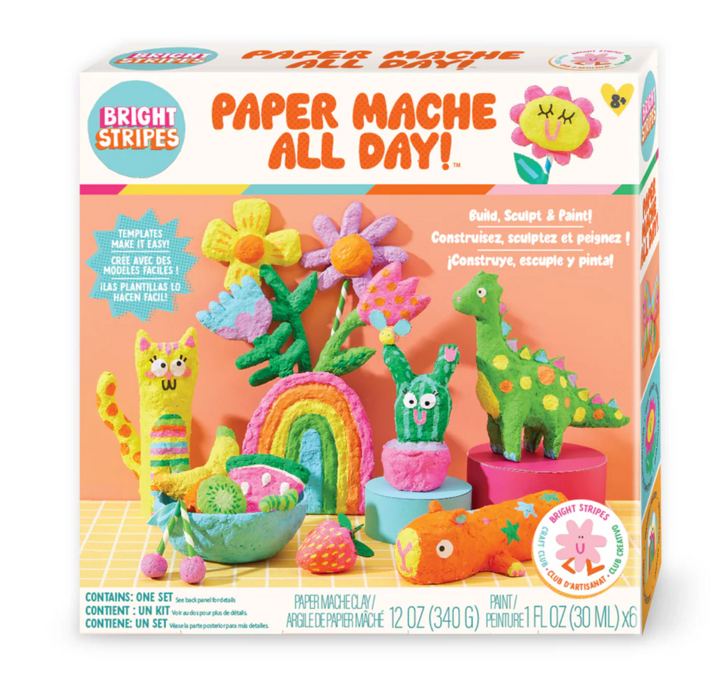 Create a variety of paper mache items with this all-inclusive kit. Simply add water! First, select a cardboard shape, assemble (if required), and then mold the paper mache mix to create the form. The paper mache comes in powder form, and turns into a form of clay once activated with water. The clay mix can be resealed and stored in the fridge for up to a week. Once finished projects are completely dry, decorate them with paint and stickers for a completely unique look!