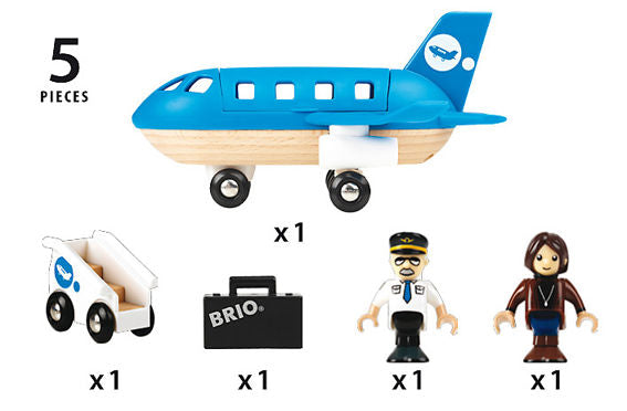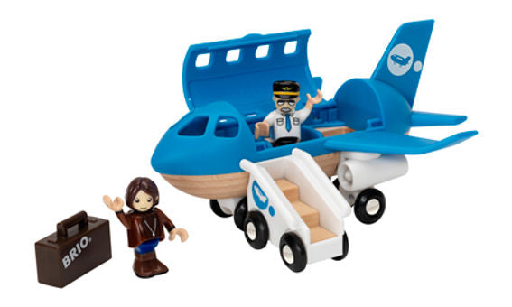 Ready for take-off! The three-seat airplane is now ready for boarding and new, great adventures lie ahead. Includes a blue airplane with a panel that opens to place the passengers, two posable figures, a rolling stair cart and a suitcase.