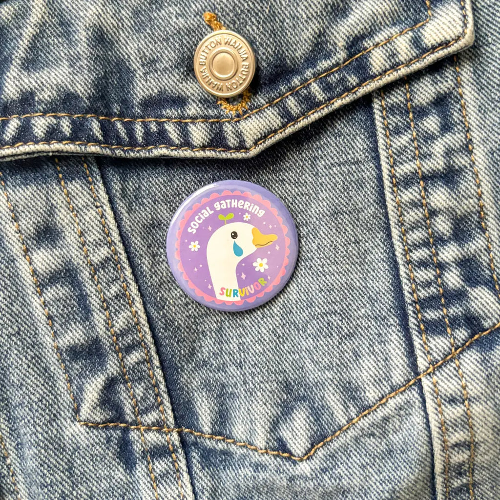 You survived a social gathering . Now show off your pride with the,Social Gathering Survivor Pin Back Button! This quirky and playful accessory is perfect for adding a touch of humor to your denim jacket, tote, or lanyard. Show off your sarcastic survival skills with this fun and unique pin! Pin Back Buttons are 37mm in size.