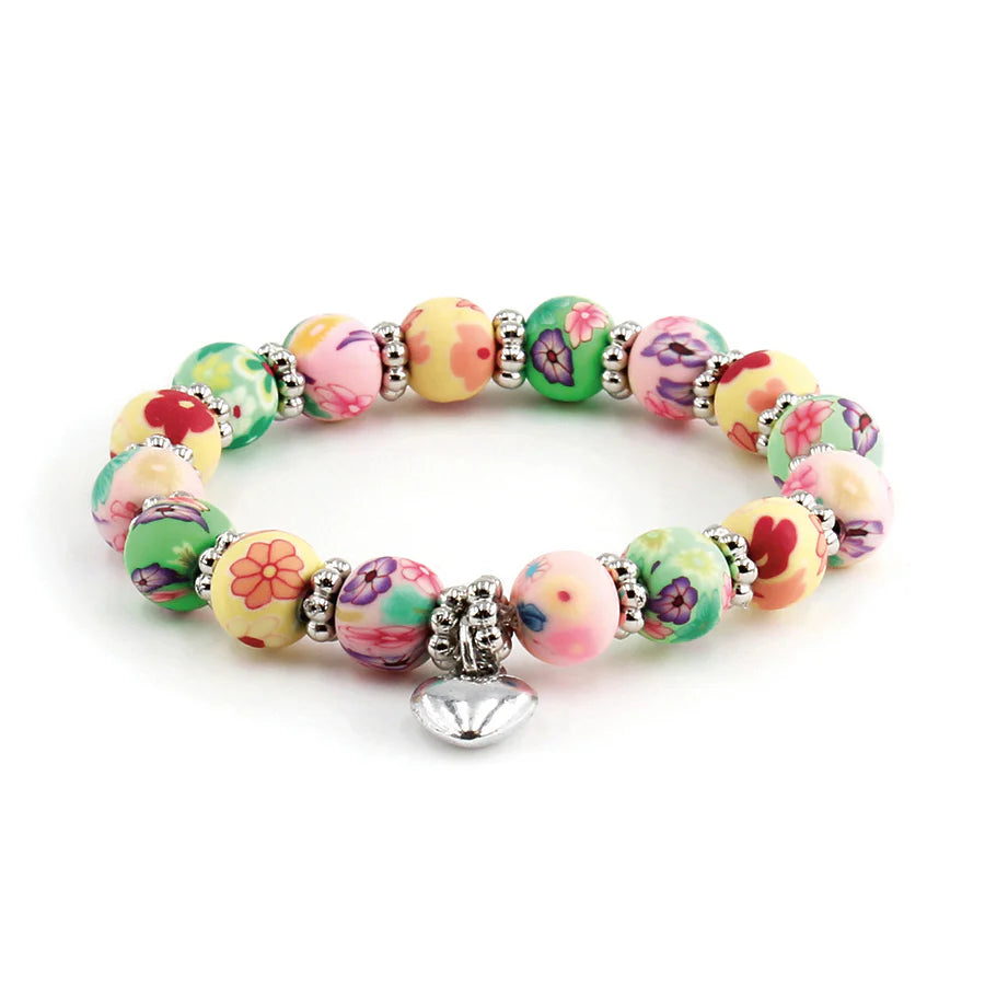 Clay Bead Kids Bracelet with Heart Charm: Pastel Floral