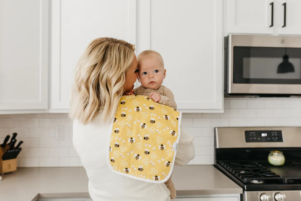 Our burp cloths are designed with baby’s comfort in mind. That’s why we created them with 100% ultra-soft cotton layers on the front (patterned) and back (plain white). You can feel confident that baby will feel cozy against your shoulder while burping.