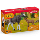 The Moose cow has a long muzzle with which she can smell juicy grass from afar. The tuft of grass at her feet tastes so good, she’d love to find some more. But her little calf isn’t interested in the green stuff yet. It prefers to drink from its mother, which beats greens for now!