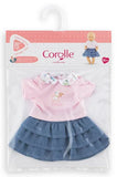 Discover the Corolle Weekend in Paris ruffled skirt and t-shirt set, a marvel for little 12" babies. With its patterns inspired by the French capital, this set will bring a touch of sophistication to your child's playtime.