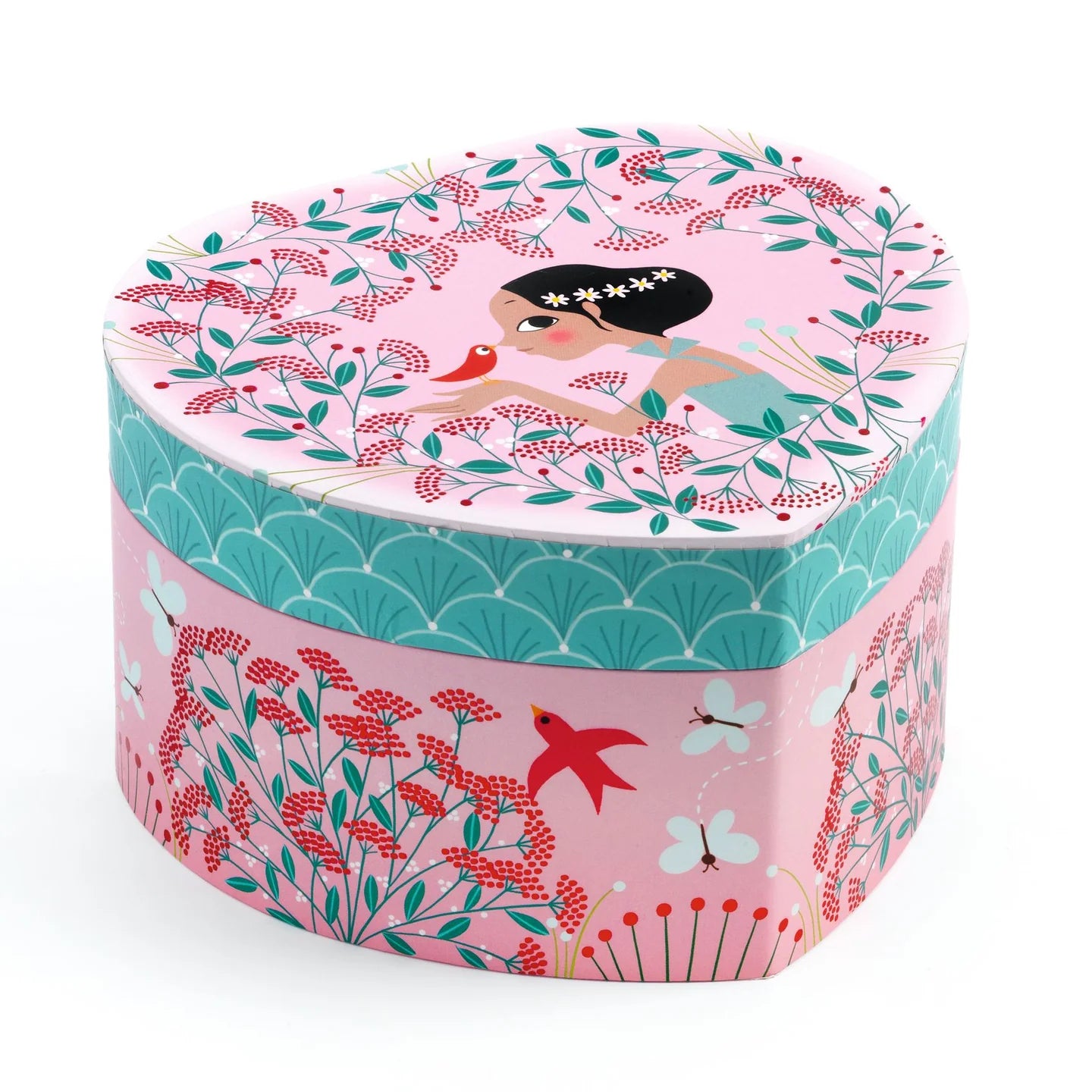 Mélodie du printemps is a pretty, heart-shaped music box for keeping jewelry and secret things in. Turn the handle and open the box for a surprise! A delicately carved dancer turns, reflected in a shaped mirror, to Carl Maria Von Weber’s “Invitation to the Dance”.