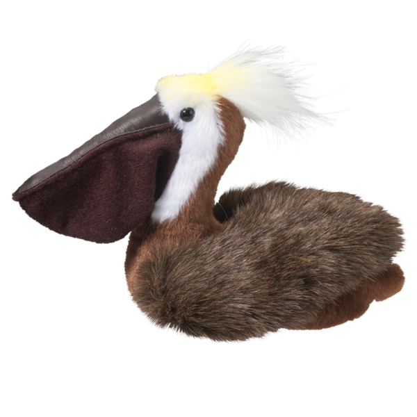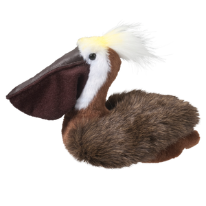 At 8" long, this soft and cuddly brown pelican is beachy keen and impossibly cute. Long white crown tuft and a leather beak make this design unique and realistic.