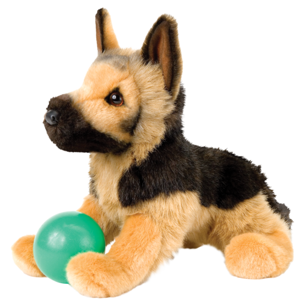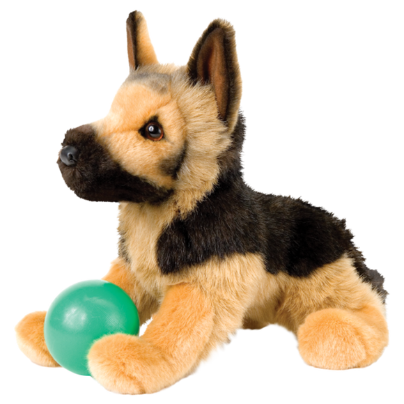 Police dog, search-and-rescue volunteer, or just a cuddly companion, whatever purpose you need him for, General the German Shepherd stuffed animal will be happy to step up to the job! Featuring a handsome black and tan coat and soft, springy interior fill, this pup is one cuddly plush! Beans in his paws lend him a lifelike weight. General’s expressive face is detailed with a generous amount of airbrushing and a sculpted black nose. His big, brown eyes and large shepherd ears will charm fans of this popular working breed. When you need a loyal friend, General the German Shepherd plush will faithfully guard your home and heart.Â
