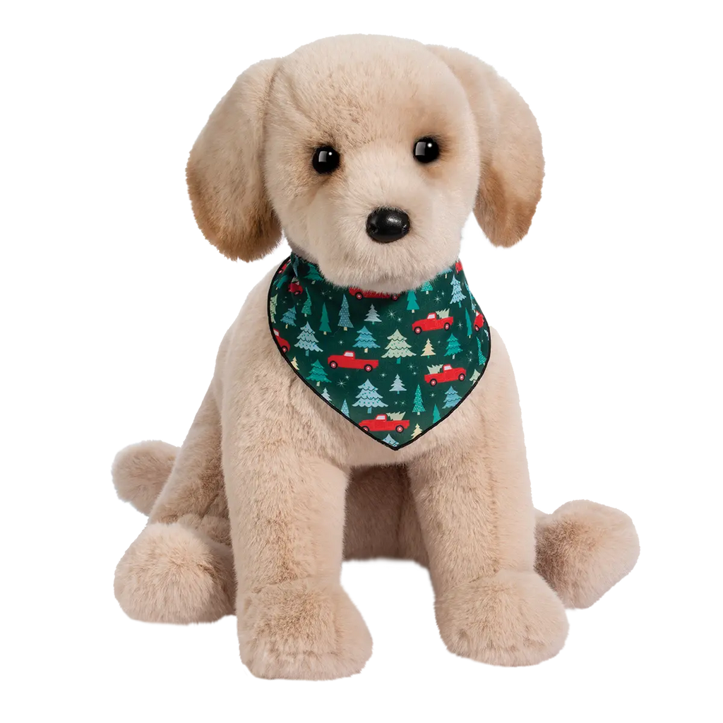 Birch the Yellow Lab is the perfect festive companion, wearing a charming green handkerchief adorned with cheerful Christmas trees and classic red trucks that capture the holiday spirit!