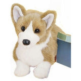 A 16 inch Classic dog by Douglas, Ingrid Corgi has soft and thick tan and white fur, brown puppy dog eyes, and a black button nose.