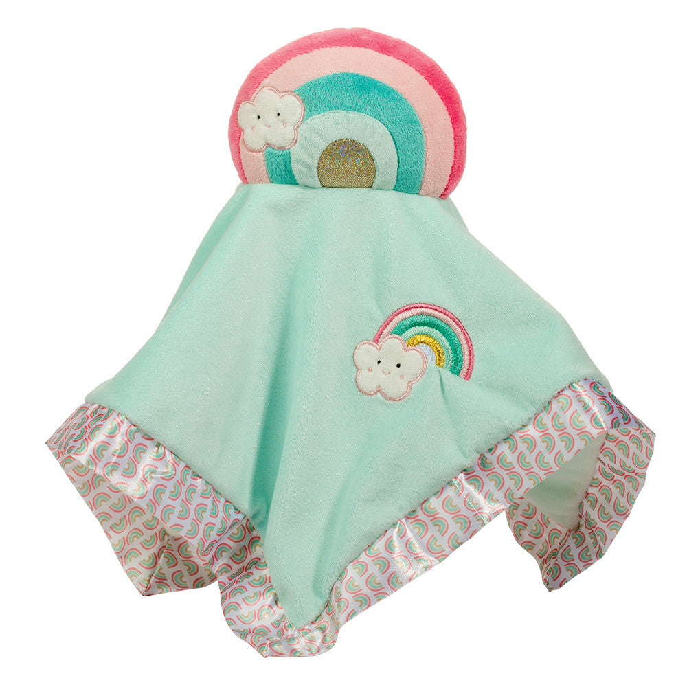 Let this cuddly Snuggler carry Baby over the Rainbow to where even the most daring dreams all come true! Ultra soothing and oh so soft, this charming plush toy will become your little one’s new favorite lovey. Crafted in light turquoise plush, it’s trimmed with a silky satin border to indulge Baby’s senses. A softly stuffed Rainbow at the top is accompanied by a matching Rainbow embellishment in infant-safe embroidery. Its small size is perfect for Baby’s arms but also packs easily into a diaper bag or stroller. Enjoy our Rainbow Snuggler on its own or look out for coordinating Rainbow Magic accessories and mix or match to build a custom set!