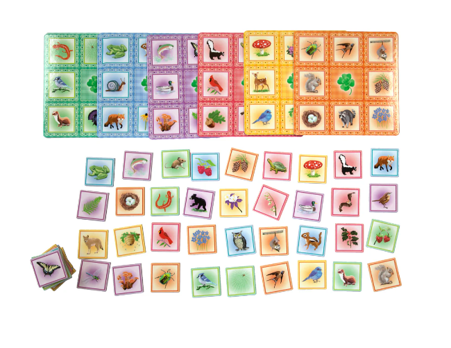 A classic Bingo game with a woodland theme, featuring sweet and gentle woodland creatures illustrated by Saxton Freymann.