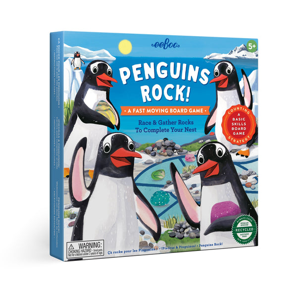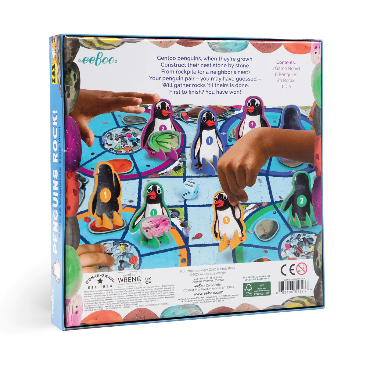 Race to complete your nest as you discover: Penguins Rock! This simple, fast-moving board game brings hands-on joy to practicing patience and strengthening counting skills. Ideal for ages 5+. Artwork by Linda Bleck.