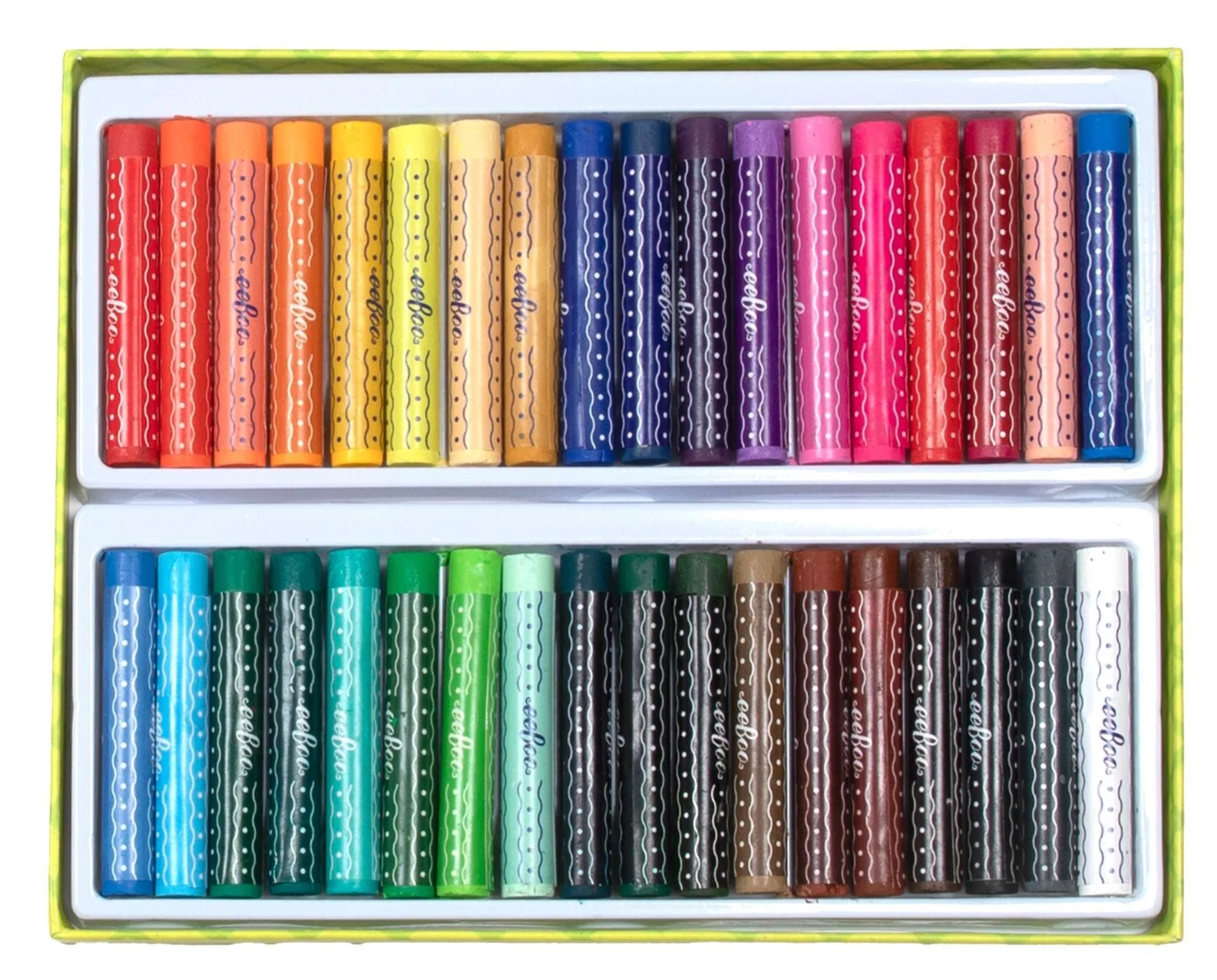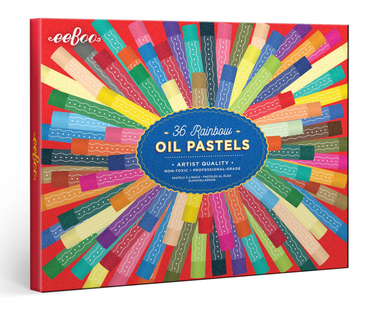 Artist-quality oil pastel sticks in a brilliant array of 36 fade-resistant, long-lasting colors. Packaged in a sturdy, sliding box featuring an explosion of color by our own eeBoo designers. Soft-touch feel and easy to blend, giving depth and subtlety to artwork on paper, canvas, or board. Pairs perfectly with our Rainbow Sketchbook.
