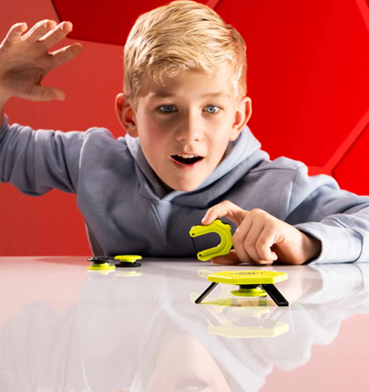 Mad, rad, magnetic action! Load one of the Mag-Pods into the shooter, pull it back with just your finger, aim, and launch. From there, endless trick-shot possibilities explode into action. Take on the challenge cards. Invent your own insane stunts. Slide, flip, and fly into gravity-defying action. But, it's not a trick until you hear it click! Magshuto. Become a trick shot master!