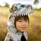 Featuring a hand-dyed teal & brown fabric, and heat-sealed sequins, our new Raptor Cape is a great addition to any dinosaur lover's collection! The cape is lightweight and soft to the touch, making it easy to wear for a long time. The hood is made of a stiffer material to hold its shape, and the cape attaches to the back with a Velcro closure. The cape is lined with a beautiful rich teal satin & finished with realistic, vibrant green eyes!