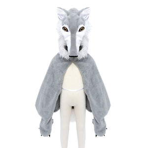 The perfect compliment to the Little Red Riding Hood costume is our Wolf Cape. This cape features a realistic one-piece wolf face,  white fur around the neck, a white tail, and attached paws. Made with an elastic loop inside the paws to easily allow your child to grip the paws even if their arms are not long enough.