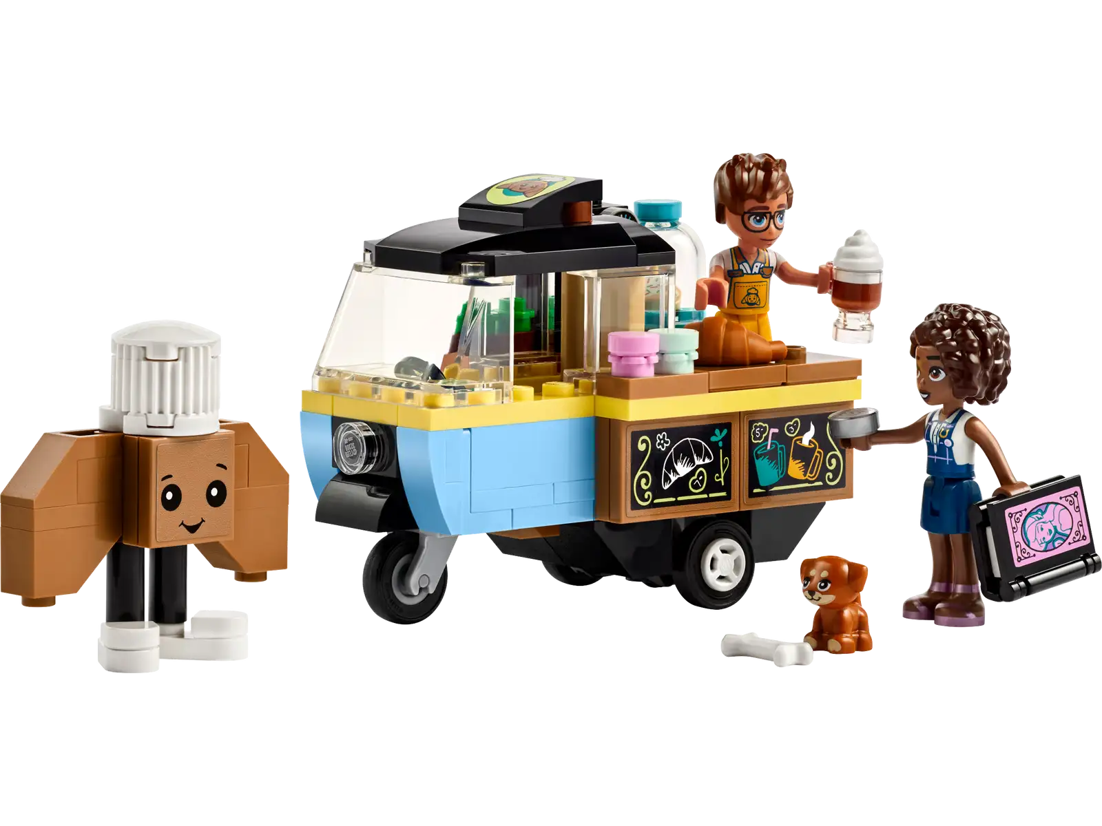 - LEGO® Friends Mobile Bakery Food Cart set – Includes 2 mini-dolls, a dog figure, a cart and lots of toy bakery accessories for girls, boys and kids aged 6 plus