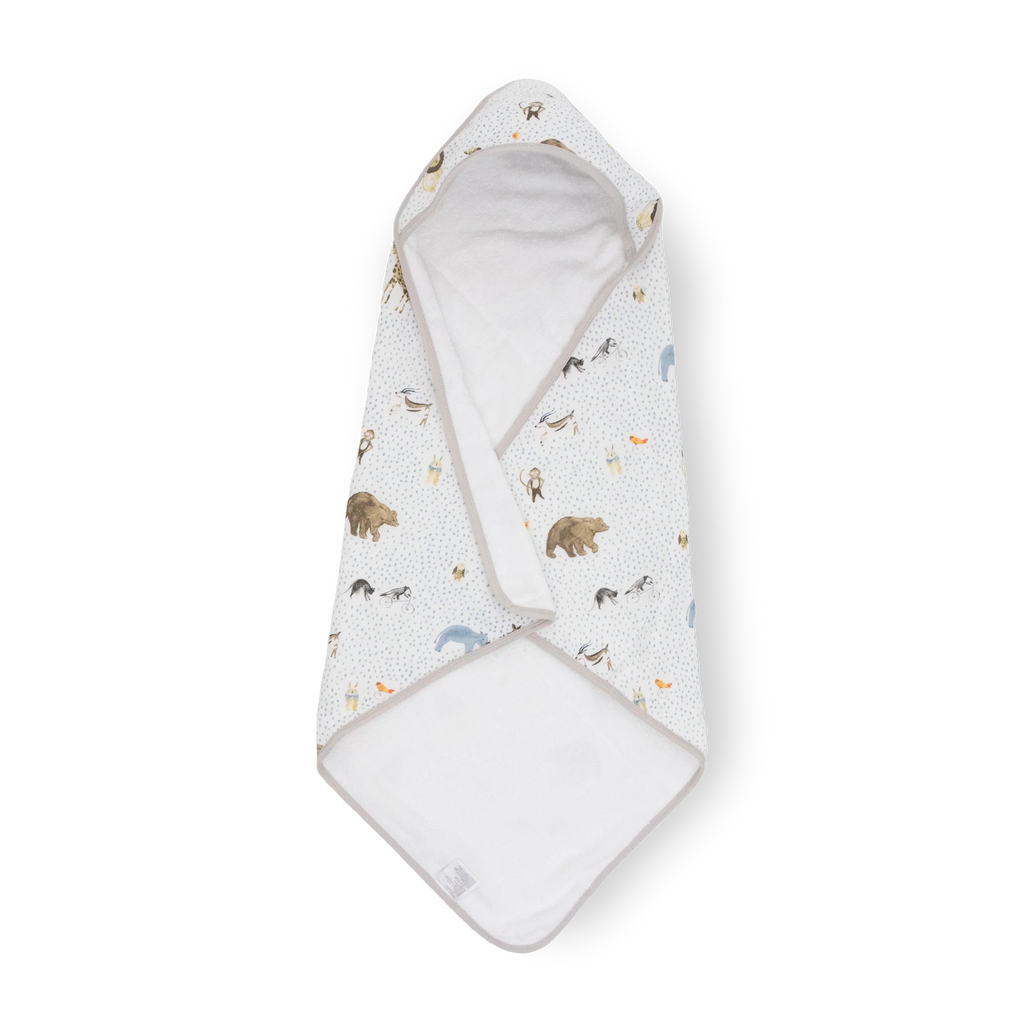 Splash into bath time with a plush and absorbent hooded towel. Featuring a cozy hood the hooded towel is crafted with printed muslin on the outside and ultra-soft terry cloth on the inside.