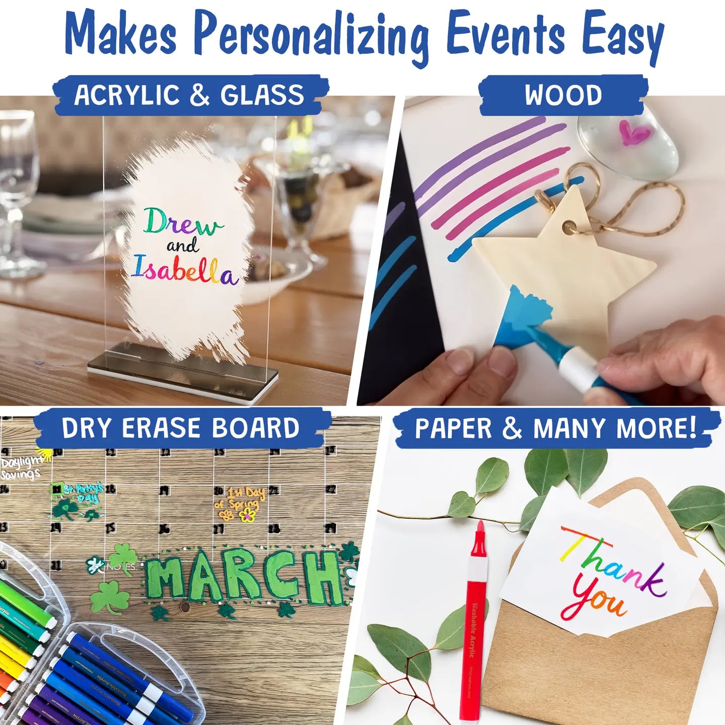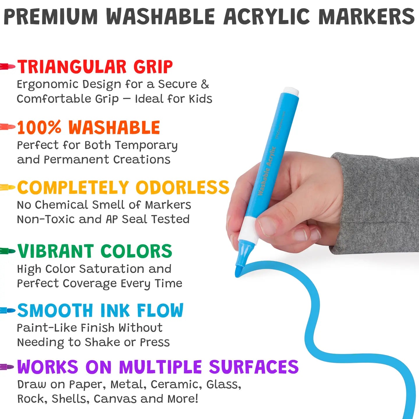Washable and Easy to Recreate: These acrylic markers are washable from non-porous surfaces like windows, mirrors, glassware, rocks, and shells, letting you erase and recreate your designs over and over. They’re also washable from skin, clothes, and most surfaces, making cleanup quick and hassle-free.