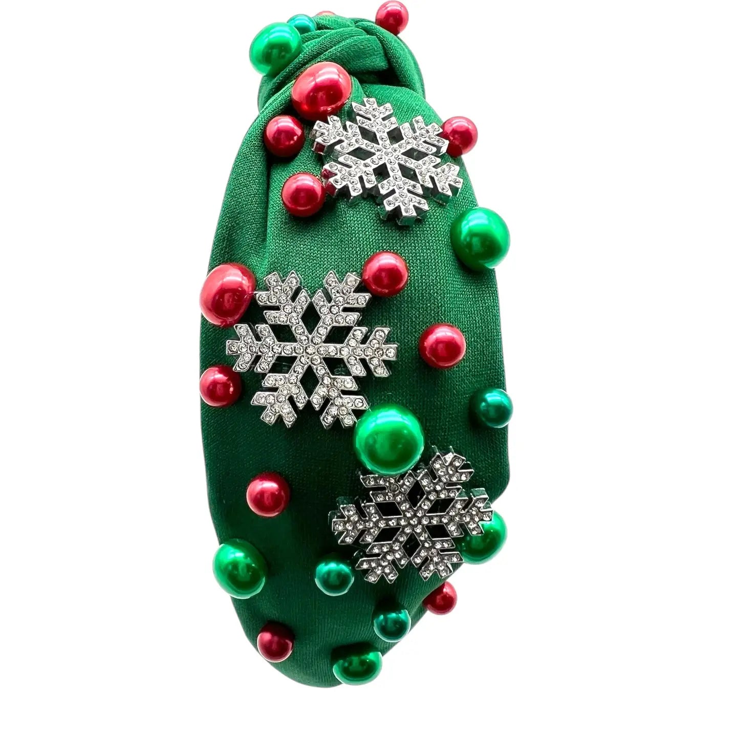 These are a brand new item! These are the latest trend in fashion headbands! This is an adorable green knot holiday headband that is adorned with crystal snowflakes and colored pearl beads! Perfect for for your festival fashionista!