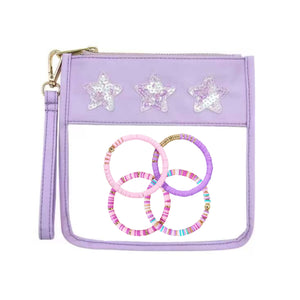 This adorable clear, lavender bag has sequin stars and a gold zipper wristlet. It comes with four friendship bracelets insides - perfect for sharing, swapping or yourself!