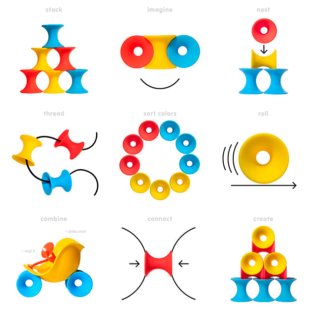 Roll them, stack them, nest them, sort them, and combine them with all your other toys. You can build them into a castle, arrange them into a smile, or even turn them into a modern work of art. Plus, made of 100% silicone, they're soft, safe, and silent, so kids AND parents are happy. What will you do with Tulu?